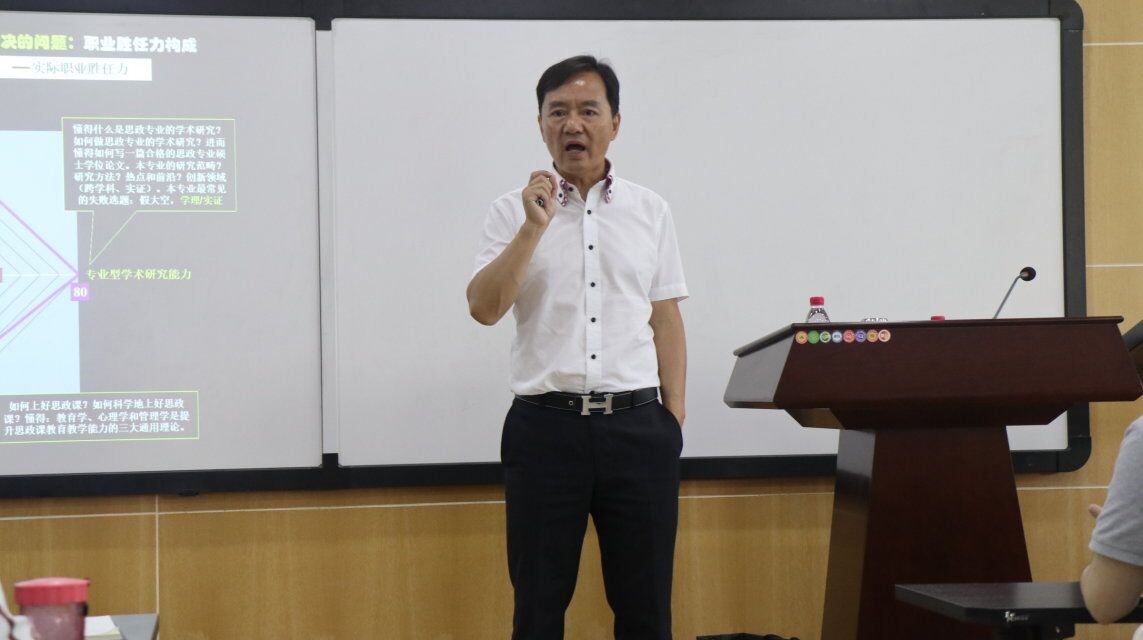 报告中,鄢显俊教授从“思政课”教育实验研究的政策依据和学理依据、 “思政课教学模式创新”、关于“思政课”教育教学改革的经验分享以及“思政专业硕士研究生实践培养模式”四个方面阐述了“思政课教育实验”的原理与方法,同时分享研究生学术训练方法。鄢教授指出,“思政课教育实验研究”的政策依据来自党中央、国务院、中宣部和教育部的相关文件以及习近平同志的重要讲话,并且具备相应的学理依据。其次,他提出“思政课教育实验”主要遵循根据教育学、心理学和管理学提出理论假设,随即展开教育实验设计,最后讨论实验结果并验证理论假设这三个步骤进行。他将大学教师知识体系的最理想构成比作“圆桌”,而将教育学、心理学和管理学三门学科比作“桌腿”,以此强调“思政课教育实验”知识更新与观念的更新的重要性。随后,鄢教授分享了自己在“思政课”教育教学改革中的经验。其中,他提出“好老师绝不唱‘独角戏’,不要把自己当成百科全书,不做‘教材复印件’”等观点赢得在场师生阵阵掌声。最后,鄢教授跟大家分享了思政专业硕士研究生实践培养的“DTT”方法,即规范化的学术阅读、同门论文阅读和讨论及听课制度及师生讨论三大方法。