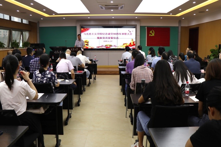 2019年6月27日,性爱影片 在408会议室隆重举行纪念建党98周年表彰大会暨新党员宣誓仪式。性爱影片 院长张邦辉、副院长徐鲲、吕进及学院全体师生党员参加了表彰大会,会议由学院党委副书记温健琳主持。
