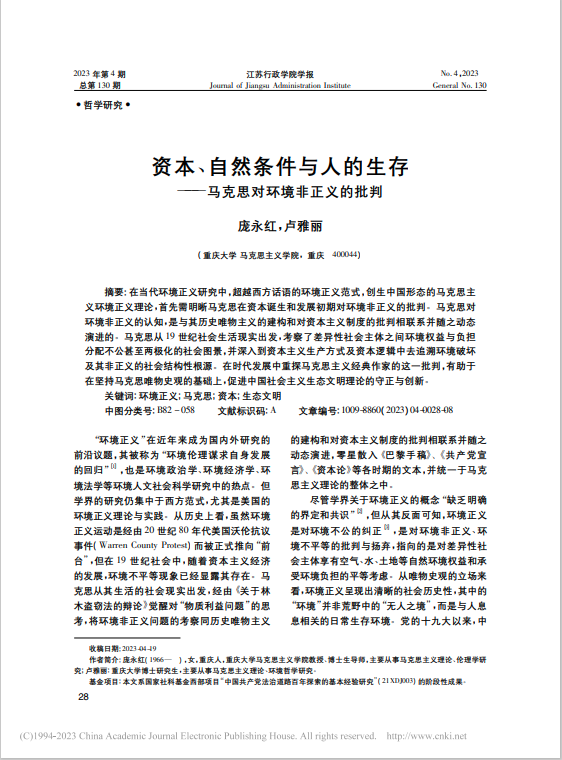 在当代环境正义研究中,超越西方话语的环境正义范式,创生中国形态的马克思主义环境正义理论,首先需明晰马克思在资本诞生和发展初期对环境非正义的批判。马克思对环境非正义的认知,是与其历史唯物主义的建构和对资本主义制度的批判相联系并随之动态演进的。马克思从19世纪社会生活现实出发,考察了差异性社会主体之间环境权益与负担分配不公甚至两极化的社会图景,并深入到资本主义生产方式及资本逻辑中去追溯环境破坏及其非正义的社会结构性根源。在时代发展中重探马克思主义经典作家的这一批判,有助于在坚持马克思唯物史观的基础上,促进中国社会主义生态文明理论的守正与创新。