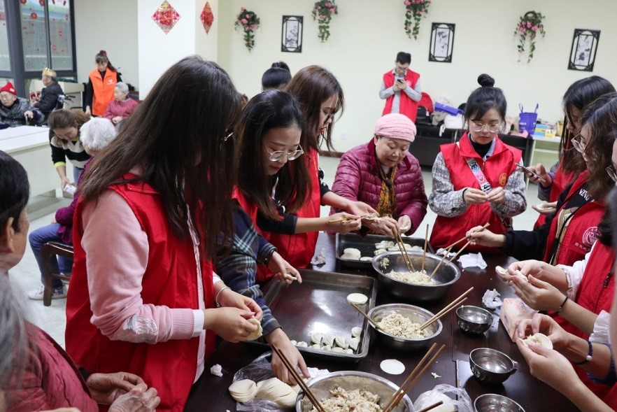 同学们和老人们一起进行了“击鼓传花”、“球球大作战”等游戏互动。喜庆欢快的音乐,瞬间点燃老人们的参与热情。志愿者们还为老人们献唱《我和我的祖国》,动人的歌曲触动了老人们的爱国情怀,一同合唱起来,饱含深情的歌声在敬老院里回荡。随后,志愿者们端上准备好的食材开始包饺子。同学们将自己的爱心与祝福同馅料一起,包进一个个香喷喷的饺子里。