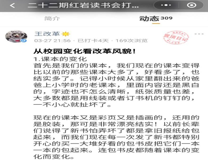 线上活动“七天打卡计划”于2021年3月24日至3月30日展开,报名参与本次活动的同学在推荐书目及影视作品中选取感兴趣的书影,坚持七天在微信小程序——“小打卡”组成的阅读圈里进行分享,通过留言、评论来交流读书或观影体会,回眸改革开放以来中国的腾飞与巨变。