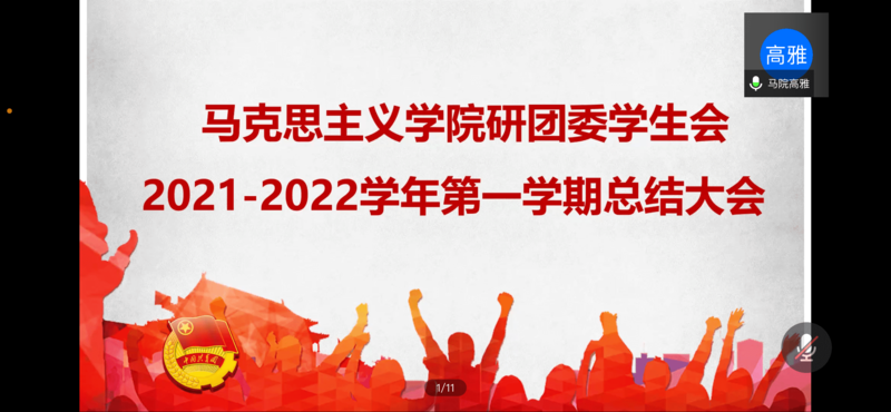 研团委学生会2021-2022学年第一学期总结大会在腾讯会议线上举行。刘倩老师及学院研团委学生会全体成员参与了本次会议,会议由高雅同学主持。