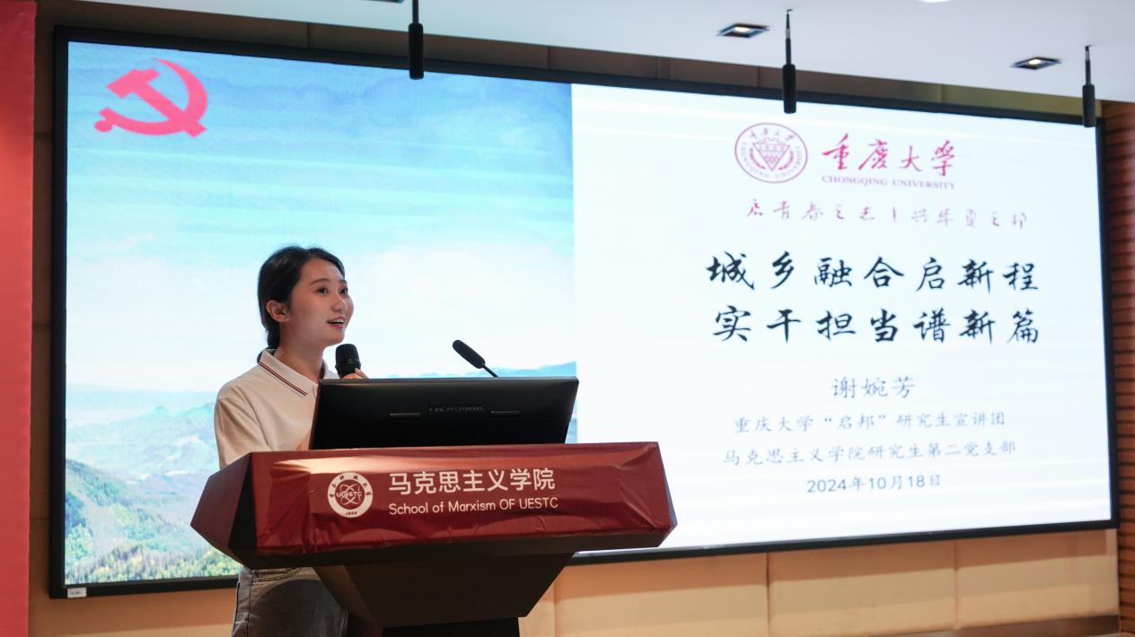 研究生第二党支部党员谢婉芳在活动中作了题为“城乡融合启新程,实干担当谱新篇”的主题宣讲。谢婉芳以党的二十届三中全会精神为核心,首先深入解读了《决定》中“城乡融合发展”政策的重大意义、显著特色以及体制机制的要求,阐明了“城乡融合发展”对于推进中国式现代化的关键性作用。随后,她又结合性爱影片