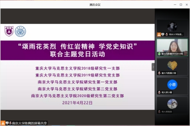 活动伊始,学院2019级研究生党部书记周志永老师在致辞中谈到,重庆和南京都是极具丰富红色资源的城市,各个时期在中国共产党的领导下涌现出了一大批理想坚定、视死如归、忘我奉献的英雄人物,熔铸了崇高的红岩精神和雨花英烈精神。通过联合开展此次主题党日活动,目的是引导研究生党员深入学习党史,传承红色基因,赓续精神血脉。并希望全体研究生党员不忘初心、牢记使命,为中华民族伟大复兴贡献力量。