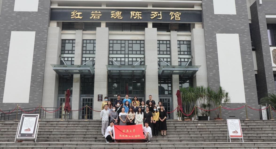 党委秘书钱婷婷、研究生一支部王锐、二支部王益萍带领入党积极分子参观红岩魂陈列馆前的英雄事迹展牌,学习英烈们宁难不苟的英雄气概和坚定不移的革命信念,补充新时代青年所需要的“精神之钙”。