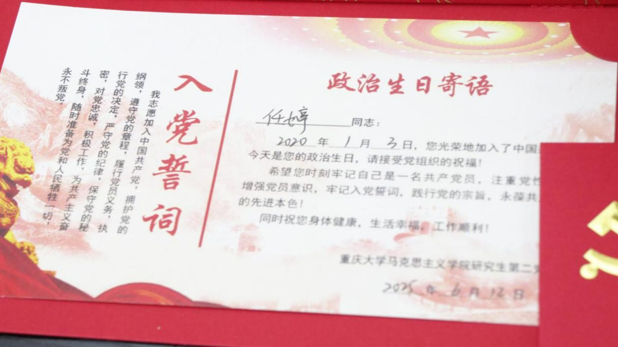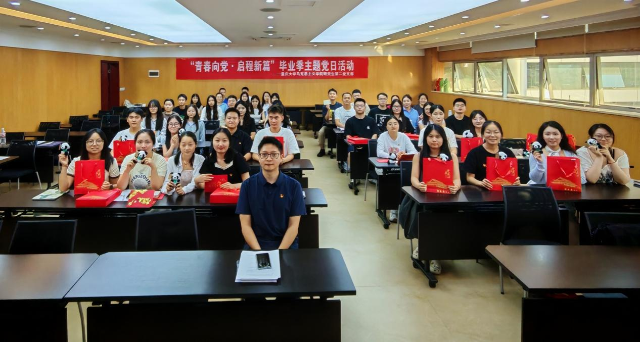 马院的求学岁月,分享了学思践悟的成长感悟。随后,支委代表向21名毕业生党员赠送“毕业行囊”,包括党徽、政治生日贺卡、校园明信片等,并展示毕业生党员寄语。