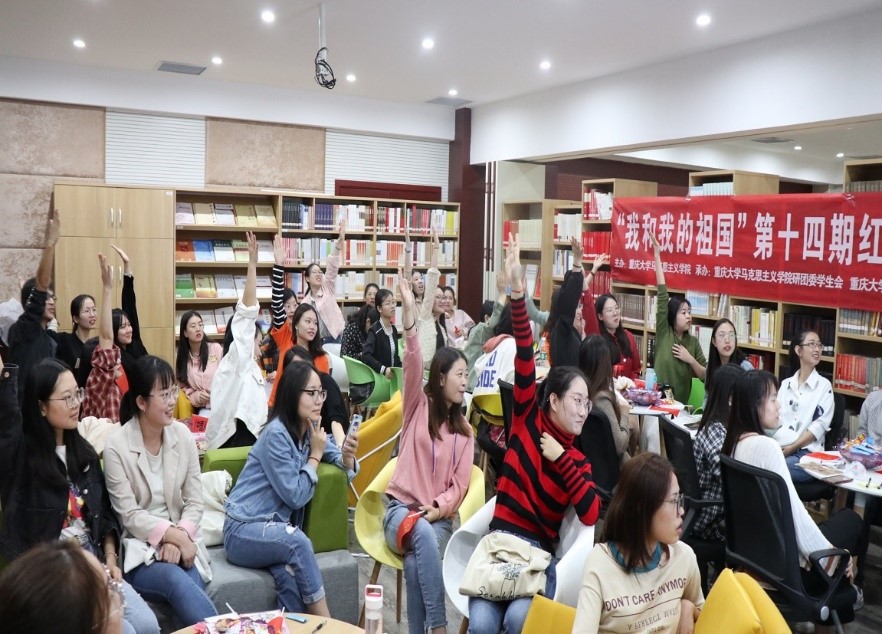 10月10日,线下活动“书友见面分享会”在性爱影片 图书馆马克思主义理论分馆进行。见面会由性爱影片 宋惠同学主持,来自西南大学、重庆交通大学、重庆邮电大学等高校的部分研究生以及性爱影片 人文社会科学高等研究院、土木工程学院等十三个学院的部分研究生参加了此次见面分享会。分享会从观盛世祖国——观看《中国一分钟》纪录片、说巍峨共和——分享研读感悟、共话祖国事——现场抢答大事件、献礼新中国——歌唱祖国四个环节进行分享和互动。