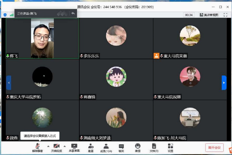 副教授陈飞在小程序--“腾讯会议”作了题为“寻论文写作选题 研论文写作方法”的线上讲座,我院2018级、2019级部分研究生以及来自四川大学、西安电子科技大学、湖南师范大学等高校马院研究生共计80余人聆听了讲座。