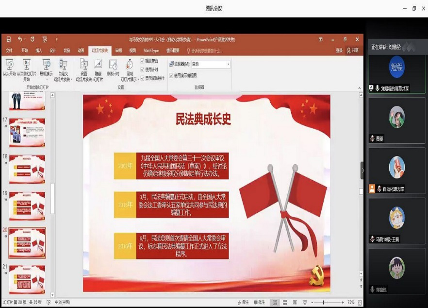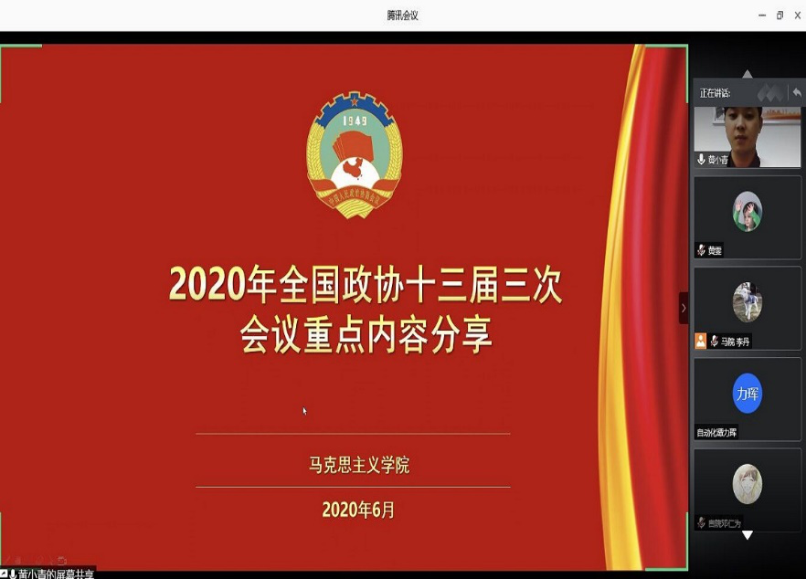 接着,自动化学院的刘煜程同学向大家介绍了全国人民代表大会第十三届第三次会议的重要内容。他从人民代表大会常务委员会审议政府工作报告、《中华人民共和国民法典(草案)》的议案、《全国人民代表大会关于建立健全香港特别行政区维护国家安全的法律制度和执行机制的决定(草案)》的议案等几个方面进行分享和解读。