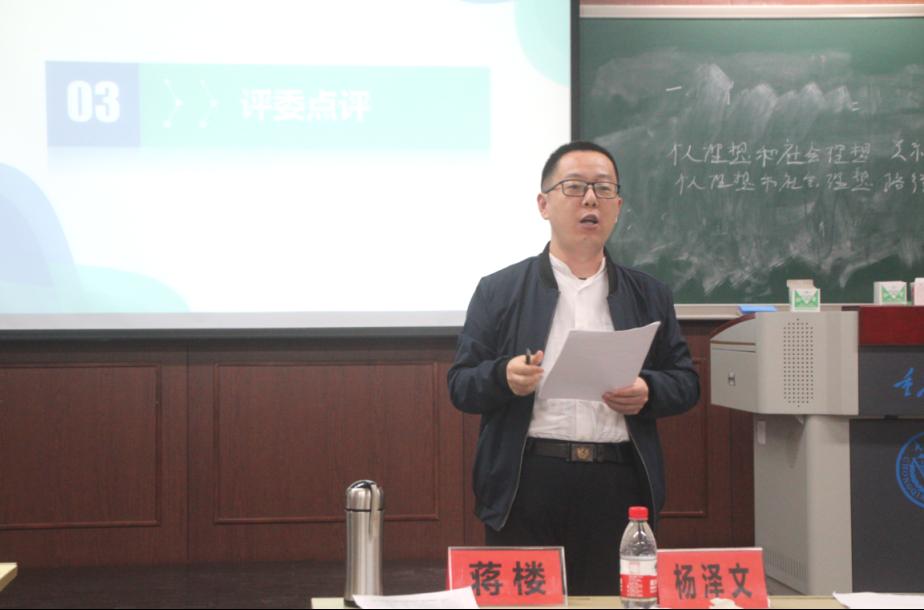 比赛结束后,各评委老师对各参赛选手进行了点评。一会场蒋荣老师建议同学们要注重讲课内容与价值引领相结合、逻辑性与趣味性相结合、启发性与互动性相结合。二会场蒋楼老师充分肯定了选手们精心准备比赛的端正态度,同时,他指出要注意授课内容的理论性、政治性和学术性。三会场魏强老师谈到,希望选手们在讲课时抓住“更准”“更深”“更美”三个关键点,一是观点和文字表述要准确;二是内容分析要深刻;三是课件制作和板书要美观。