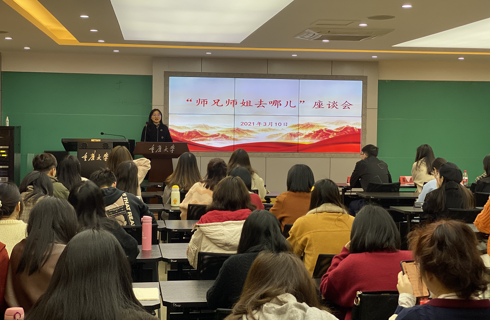 2021年3月11日下午,学院在408教室举办“师兄师姐去哪儿”座谈会,学院邀请陈妍西、何丽玲、尚杨、蒋弦四位毕业生向在校同学分享就业、求学等经验,学院党委书记罗滌,党委副书记温健琳参加座谈。
