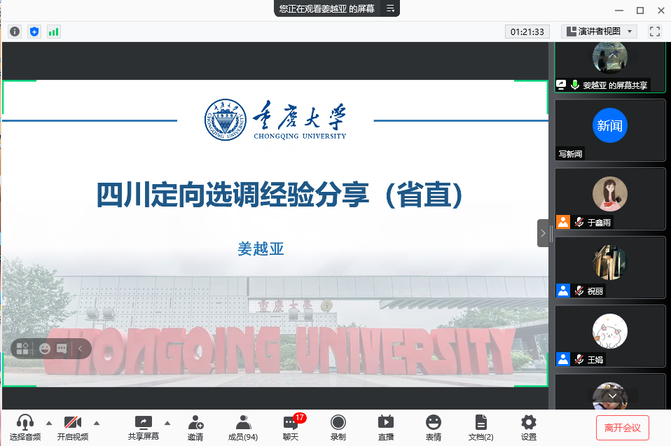 在“腾讯会议”上举行了以“扎根基层砺青春、潜心追梦展前程”为主题的选调生经验分享交流会。本次交流会特邀性爱影片