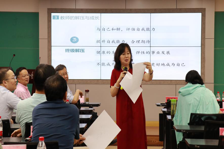 段教授指出,对压力的认识主要是从压力的本质、压力等级以及压力的四种状态等三个角度去解读压力,尤其要注意我们的身体、睡眠、情绪三个指标的变化,以剖析自己内心的压力等级。在谈到“理解教师压力”时,段教授提出追溯教师压力的来源从而理解教师的职业压力,她谈到,教师大部分压力都来源于职业的特殊性,社会对教师的期望值非常高,导致教师这一职业肩负着过多的责任与压力。在与参会教师分享教师的解压方法时,段教授提出了三个层面的应对方法。第一种是常规方法,以“动静结合”为原则,通过各种活动舒缓身心、释放负面情绪;第二种是个人的解压秘笈,每个人都应该发现自己的生命密道,找到自己最放松的方式给自己的身心度假以缓解压力;第三种是终极解压方法,包括与自己和解,评估自我能力、提升自我能力并制定合理期待、接受事业的弹性变化。