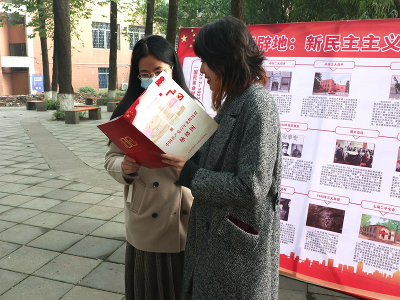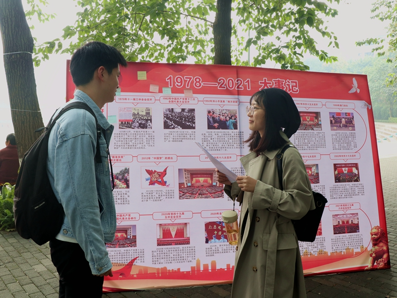宣讲团成员的带领下,参观学习了“开天辟地:新民主主义革命时期”与“1978-2021大事记”两大主题图鉴,从中了解了中国共产党百年奋斗的红色故事以及蕴含的红船精神、长征精神、红岩精神等革命精神。一名退休教师在参与展览活动后表示,“历史证明了中国共产党的领导是正确的,中国特色社会主义道路是正确的,你们年轻人要以史为鉴,永远跟党走。”