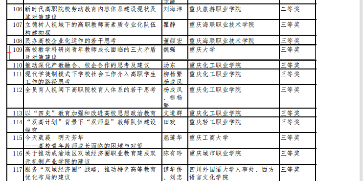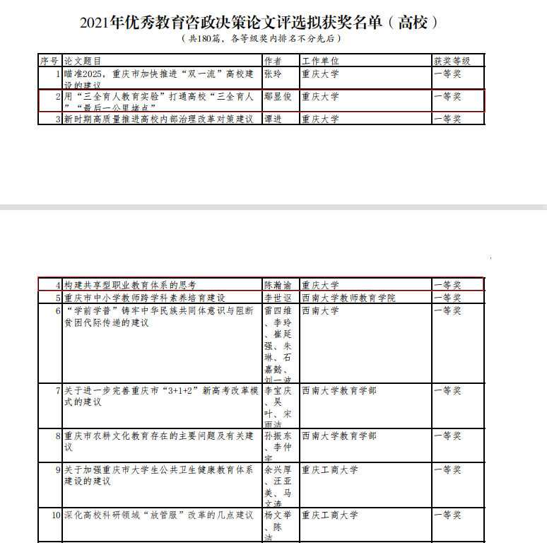 近日,重庆市教育委员会公布了2021年教育咨政决策论文获奖名单,性爱影片 鄢显俊教授撰写的《用“三全育人教育实验”打通高校“三全育人 ”“最后一公里堵点”》一文,青年教师陈瀚谕撰写的《构建共享型职业教育体系的思考》一文荣获一等奖,魏强副教授撰写的《高校教学科研岗青年教师成长面临的三大矛盾及对策建议》荣获三等奖。