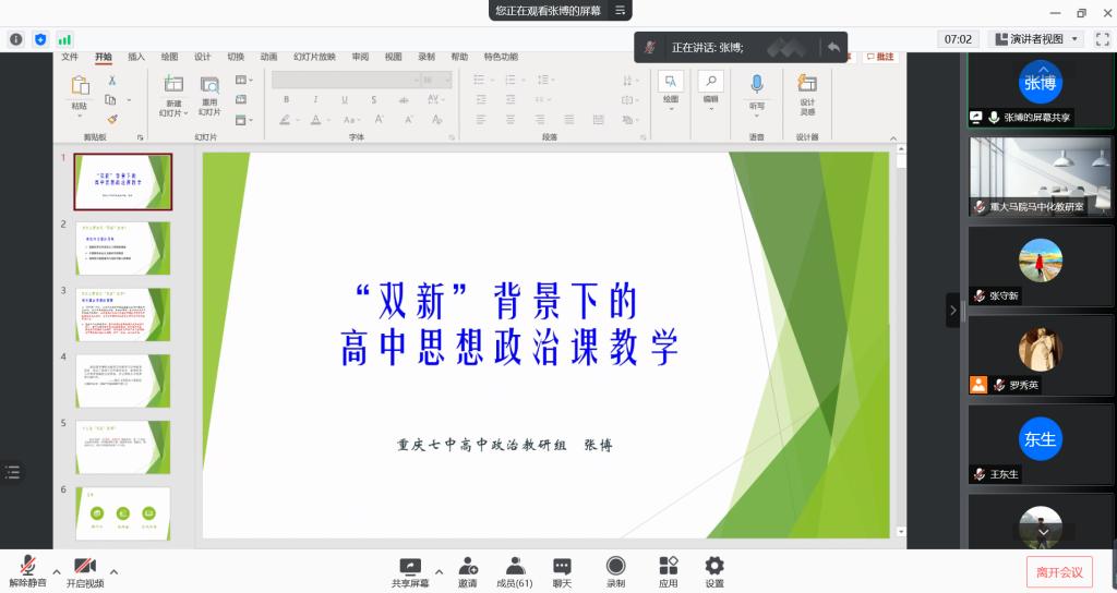 重庆第七中学的张博老师以“‘双新’背景下的高中思想政治课教学”为题进行主题发言,张博老师围绕“双新”背景下高中思政课堂的有效实施路径,引导学生增强中国特色社会主义道路自信、理论自信、制度自信、文化自信,厚植爱国主义情怀,落实立德树人根本任务进行了详细阐释。