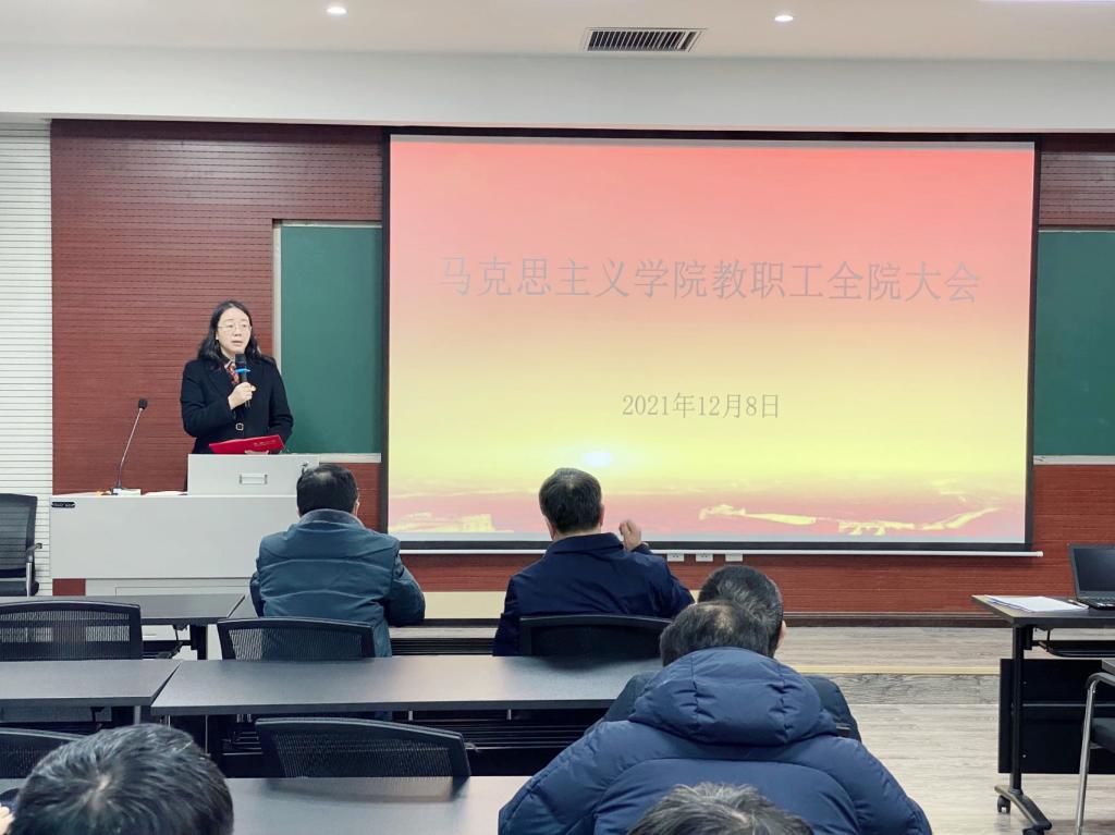 在406教室召开2021年第九次全院教职工大会,学院党委书记罗滌、院长张邦辉、党委副书记温健琳、副院长徐鲲及全院教职工参加大会,罗滌主持会议。