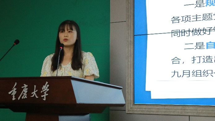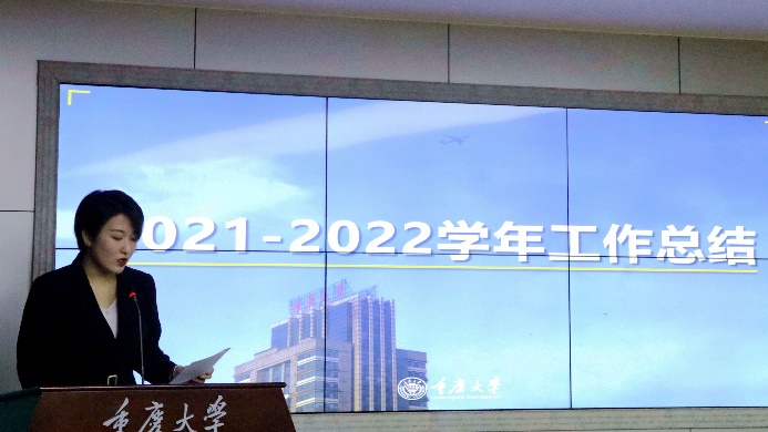 首先,研究生分会董瑞祺同学做2021-2022学年工作汇报。从组织建设、活动建设、外宣建设三个方面总结了上一学年研团委学生会的工作。上一学年学院研究生分会共获七项团体奖项,取得了优异成绩,希望在新学年研会工作努力实现一个“突破”,三个“转变”,力争取得更好的成绩。