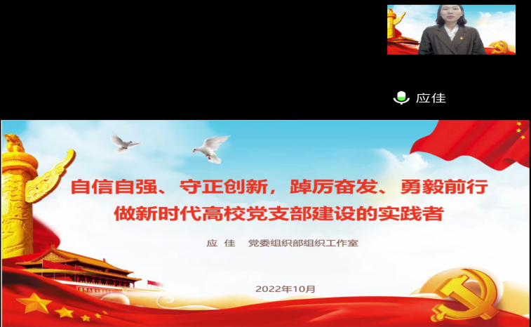 在支部工作培训中,应佳以“自信自强、守正创新,踔厉奋发、勇毅前行做新时代高校党支部建设的实践者”为题,从“学校有关新时代高校党支部建设的政策依据”、“中国共产党支部工作条例(试行)——党支部职责和任务”“中组部贯彻落实《党支部工作条例(试行)的具体措施》”等三个方面进行了详细地分析,指导大家如何履行好支部书记和支委的工作职责,切实做好新时代高校党支部建设工作,把基层党组织建设成为有效实现党的领导的坚强堡垒。
