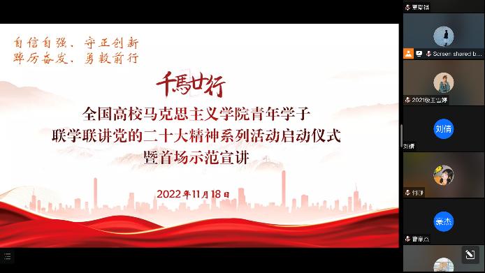 院长朱安东等与会领导发表讲话,教育部社科司副司长宋凌云为活动授旗。接下来,来自清华大学、北京大学、中国人民大学、北京师范大学的学生讲师做示范宣讲。直播结束后,与会师生热烈讨论并分享感悟。