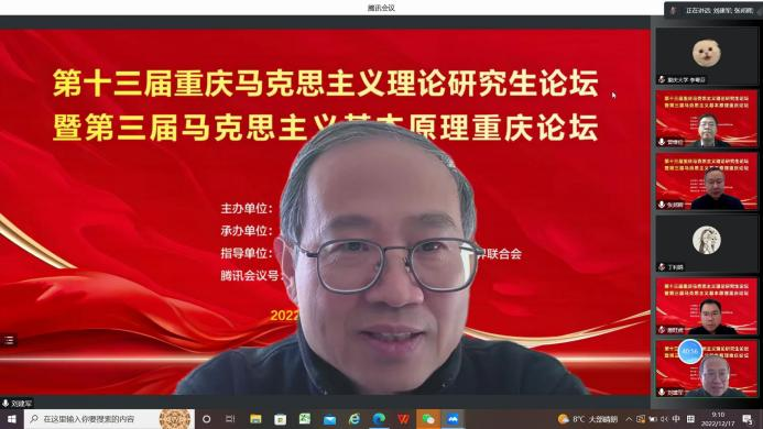承办,中共重庆市委宣传部、重庆市社会科学界联合会为指导单位。论坛邀请了中国人民大学、西南大学、西南政法大学、重庆邮电大学、重庆师范大学等高校的17名马克思主义基本原理学者作主题报告,来自重庆市10余所高校的240余名师生参加此次论坛。