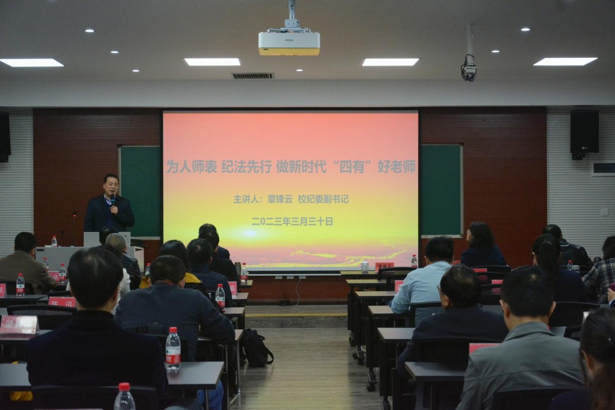 校纪委副书记章锋云为马院全体党员及教职工做了《为人师表 纪法先行 做新时代“四有”好老师》的主题报告。他将党的二十大精神融入到讲座内容中,根据上级纪检部门的要求,结合高校教师违纪违法的典型案例进行讲解,讲座条例清晰,内容丰富,指导性强。他要求全体党员要以实际行动遵守从严治党要求,守好纪律的红线,不触碰法律的底线,强化纪律意识、规则意识,为人师表,行为示范,争做新时代的“四有”好老师。