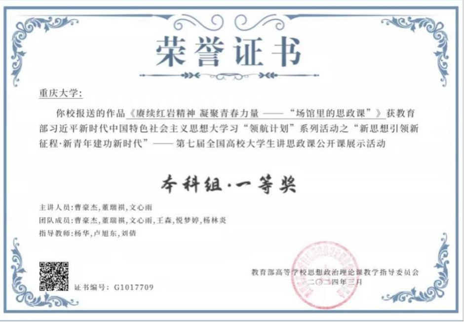 教师杨华、卢旭东、刘倩指导的学生团队曹豪杰、文心雨、董瑞祺、杨林炎、悦梦婷、王森,报送的参赛作品《赓续红岩精神凝聚青春力量——“场馆里的思政课”》荣获一等奖。