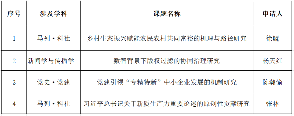 2024年10月15日,全国哲学社会科学工作办公室正式发布了2024年度国家社会科学基金年度项目立项名单。我院立项4项,其中徐鲲教授、杨天红副教授获2024年国家社会科学基金一般项目立项,陈瀚谕副教授、张林博士获2024年国家社会科学基金青年项目立项。