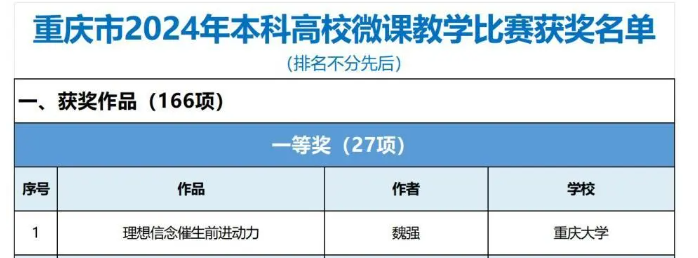 近日,由重庆市教育委员会主办的重庆市2024年本科高校微课教学比赛获奖名单公布,我院魏强教授获一等奖。此前魏强教授先后获重庆市本科高校微课教学比赛2019年三等奖、2022年二等奖、2023年三等奖。