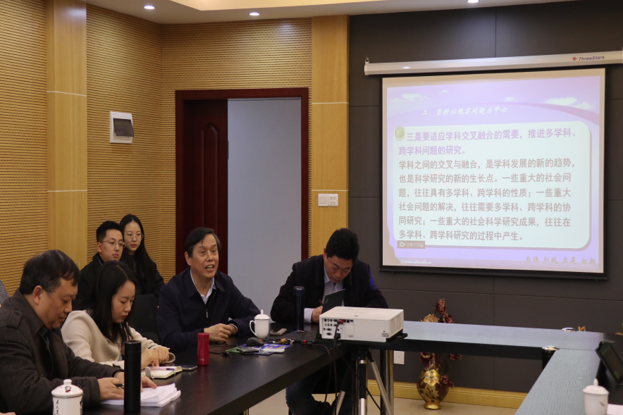 社科处处长袁文全教授对项目申报进行指导。学院院长张邦辉、副院长徐鲲、副院长吕进及学院部分教师参加会议。