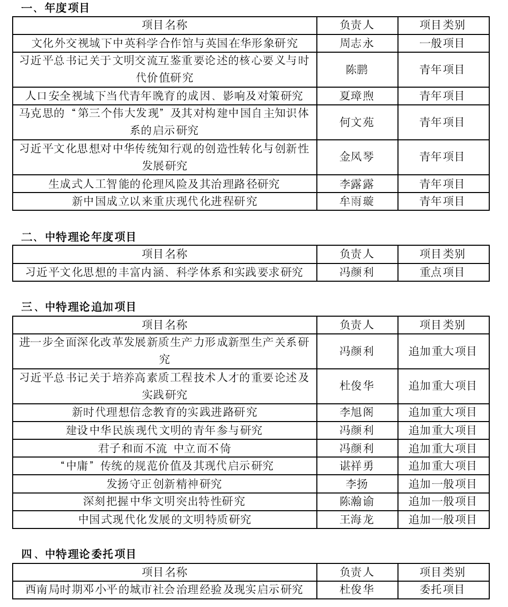 近日,重庆市社会科学规划办公室公布了2024年度重庆市社会科学规划项目立项名单,马院教师共立项18项,其中年度项目7项,中特理论年度项目1项,中特理论追加项目9项,中特理论委托项目1项。